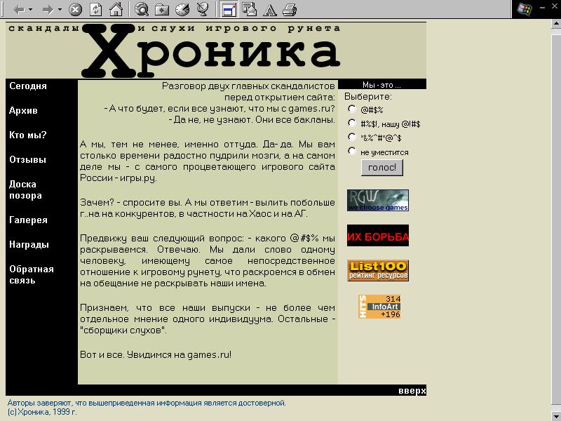Наверно, в детстве Вовочка больно ударился головой о стенку кроватки, поэтому кул хацкера из него не вышло. А хотелось! Вот и придумал наш герой такую операцию: под видом профессионального дизайнера-мецената, предложить не в меру доверчивым скандалистам свои услуги. Бесплатно. То есть даром. Что, согласитесь, довольно удивительно. Некий dedok, без имени-фамилии, без готовых работ и собственной студии за "просто так" готов помочь начинающим талантам. Мы сделали копию сайта и дали, как этого просил дедок, пароль для доступа. Вместо того, чтобы, как обещалось, залить в отдельную директорию бету нового дизайна, он поменял пароли, все стер и повесил вот эту гадость. Разумеется, все это время наши общие знакомые наблюдали, как возомнивший себя мастером провокаций Вованчик писался от радости. Добрые люди, спасибо, что сообщили! После небольшой проверки вся информация подтвердилась. Письмо Владимира Романова: "Уважаемые скандалисты! Ну правда он душка? Научите человека, чтобы в следующий раз он гадости более грамотно делал. Мы же как-то брезгуем... Поздравляем! Сайт Nuclear Xaos с таким изобретательным ньюсмейкером. Самого Вованчика - с тем, что наконец-то он стал знаменитым. Торик, которому так никто и не дал. Если человека долго обижать, он становится злым и обидчивым. Обиженный Торик - зрелище жалкое и одновременно противное. Слава писал посредственные статейки про игры и искренне надеялся, что их будут печатать. Сначала его послали куда подальше в НИМе, затем в Game.exe. Попытки попасть в СИ, никогда, надо заметить, не отличавшуюся хорошим качеством статей, - и то закончились неудачей. Может, Торику удалось сделать карьеру в игровом рунете? Опять мимо. Его выгнали с Хаоса, после первой же статьи "попросили" из АГ, не приняли работать в .Exe-online. Трудно сказать, чем мы так "насолили" Торику. Однако после выхода уже первого выпуска "скандалов" он написал письмо админам чат.ру с просьбой прикрыть наш сайт. Оказывается, господа, наша страничка "нарушает этические нормы игрового рунета, распускает лживые слухи и убеждает читателей в своей правоте, которая подрывает честную деятельность многих уважаемых лиц". "Огромная просьба принять меры в отношении данной странички" - завершает Торик свой донос. Вот, оказывается, что! Слава О ВАС, дорогие читатели, заботился! Вы, бедные, читаете наши статьи, рвотные порывы еле-еле в себе сдерживаете, а выход-то был, - наябядничать куда следует, и все дела! Молодец, Торик! Как однажды сказал г-н Исупов, "каждый на твоем месте поступил бы точно так же!". Но мы не злопамятные. Хочется порадоваться за нашего юного ябеду. Добрые дяди из журналов "Мегагейм" и "Хакер" дали Торику еще один шанс самореализоваться, продолжить свою "честную деятельность". Поддержите его - покупайте и читайте эти издания! После прихода Торика-стукачка, они наверняка будут интереснее. Надеемся, что хотя бы после этого Слава перестанет врать и писать доносы. P.S. "Скандалы" выражают благодарность администрации системы da.ru за то, что они не последовали совету Торика и не удалили наш псевдоним. Павлик - нехороший мальчик. Обманывает друзей, накручивает счетчик, клевещет на невинных людей, не любит прессу. Гражданин Paul организовал в свое время недурственный сайтик Planet-Extreme, но на этом вся его продуктивная деятельность закончилась. Во-первых, он фальсифицировал статистику своег